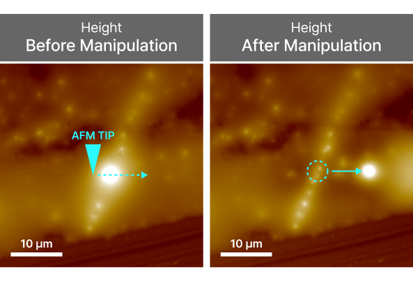 Here comes nanolithography by mechanical manipulation at the nanoscale, specifically showing controlled displacement of a silicon carbide (SiC) particle. By applying targeted force with the AFM tip, the particle was successfully shifted laterally on the substrate. This technique highlights nanolithography's capability for precision positioning and assembly of individual nano-objects.