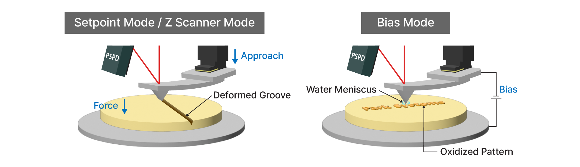 It operates primarily via two mechanisms: bias mode lithography, where an electric field generated by a voltage bias on the AFM tip induces localized chemical modification (such as anodic oxidation) to form nanoscale oxide features on semiconductor or metal surfaces, and force (Setpoint/Z scanner) mode lithography, which uses mechanical motion of the tip under controlled force to physically remove material or deform soft substrates. The process allows for the direct writing of arbitrary patterns with nanometer precision, without the need for masks or resist layers, and enables simultaneous characterization of surface topography and friction using modes like LFM or TFM. AFM nanolithography is particularly advantageous for fabricating prototype nanodevices, testing material properties, and producing features in environments unsuitable for electron beam or ion beam techniques, such as those requiring low energy input or ambient conditions.