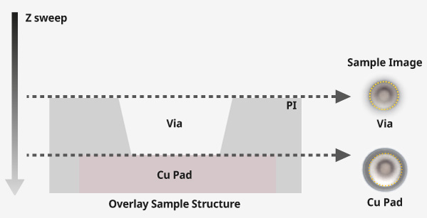 Park Systems' well-established AFM Z scanner technology forms the foundation for an independent Z scanner, offering a 30 µm sweeping range with AFM-level precision to find the optimal focal plane. A high-resolution (HR) and shallow Depth of Focus (DOF) objective lens enhances image contrast and facilitates profile edge detection. By comparing the concentric circles of each layer obtained in this way, the offset value can be automatically measured.