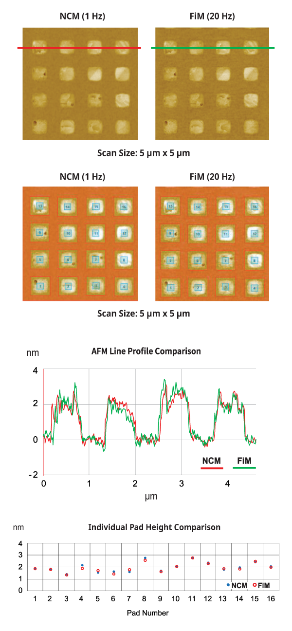Park’s fast imaging mode (FiM) provides reliable data for Cu pad measurements with high throughput. The Cu pad data from the fast imaging mode delivers line profiles and height values equivalent to those obtained in True Non-contact™ mode. The proprietary analysis algorithm can analyze each Cu pad regardless of pad shape or array arrangement.