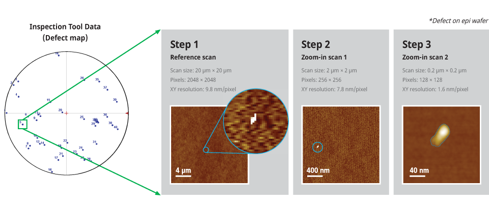 The ADR function provides further analysis of defects detected by conventional defect inspection tools. The defects are automatically scanned by AFM once inspection tool data with defect coordinates is uploaded. Defect types and profiles are automatically analyzed in detail using zoom-in scan data.
