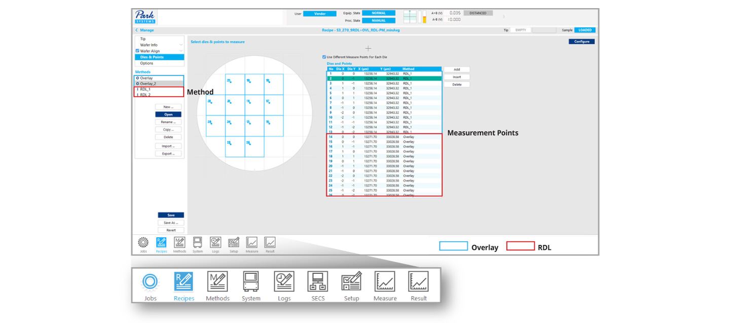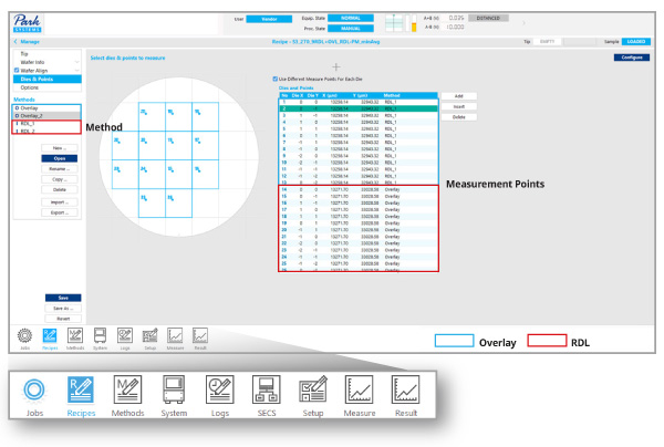 XEA offers practical features such as easy copy/paste of recipes, specialized editing modes, and real-time recipe updates. Additionally, a single recipe supports both overlay and RDL measurement methods. With built-in functions providing comprehensive system operation—including parameter adjustment, database management, and maintenance—the interface remains straightforward and user-friendly. The navigator provides an intuitive user interface that integrates system adjustment and operation.