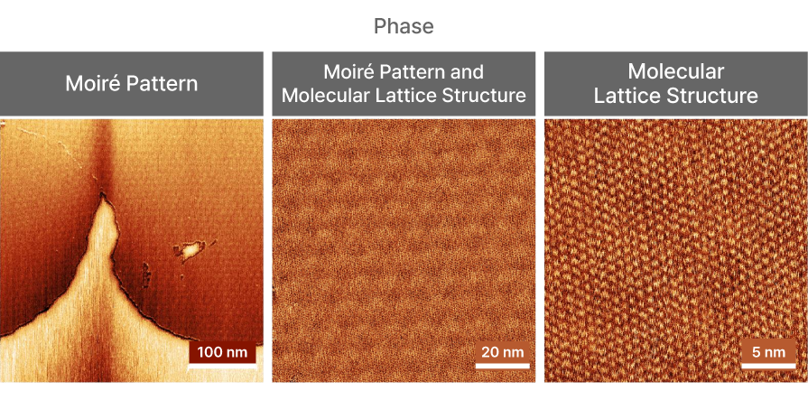 The phase images capture the co-adsorption of melamine and cyanuric acid on an atomically flat HOPG surface, revealing a 2D molecular network with a distinct periodicity of 0.98 nm. Due to lattice mismatch between the molecular network and the underlying HOPG substrate, a Moiré pattern is visualized alongside the lattice structure. This demonstrates Tapping mode’s unique capability to resolve both molecular arrangements and superstructure modulations critical for nanostructure engineering and materials science.