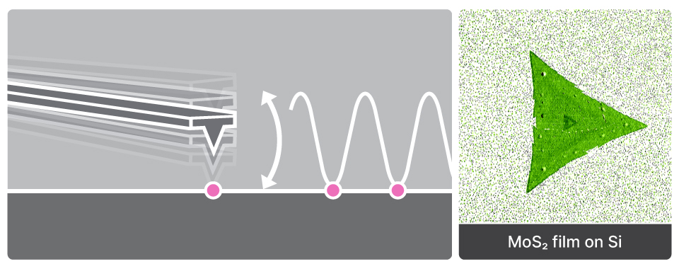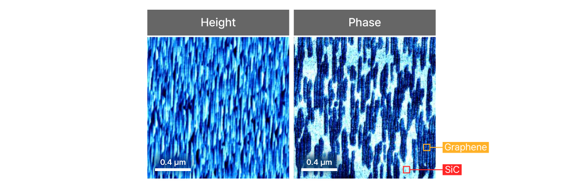 Tapping mode excels in distinguishing materials with similar surface topography by leveraging phase imaging sensitivity to mechanical properties. In the figures, graphene flakes on a SiC substrate are indistinguishable in the height image, but clearly separated by phase contrast. Phase imaging by Tapping mode reveals material-specific viscoelasticity and adhesion differences, enabling effective identification and mapping of graphene versus substrate regions without relying on topographic variation. This exemplifies the value of tapping mode for studying composite nanostructures and material distributions at the nanoscale.