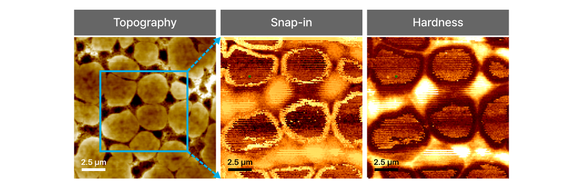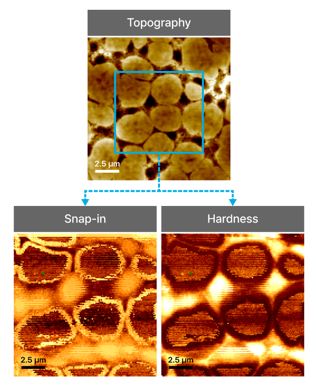Force volume imaging provides a detailed map of the sample’s material properties by plotting parameters such as stiffness, cantilever snap-in, and adhesion. Parameters extracted from Force Distance (F-D) spectroscopy curves are put into a matrix that quickly and easily allows researchers to gain insights about samples properties.